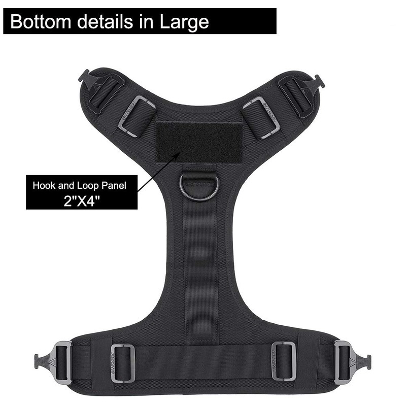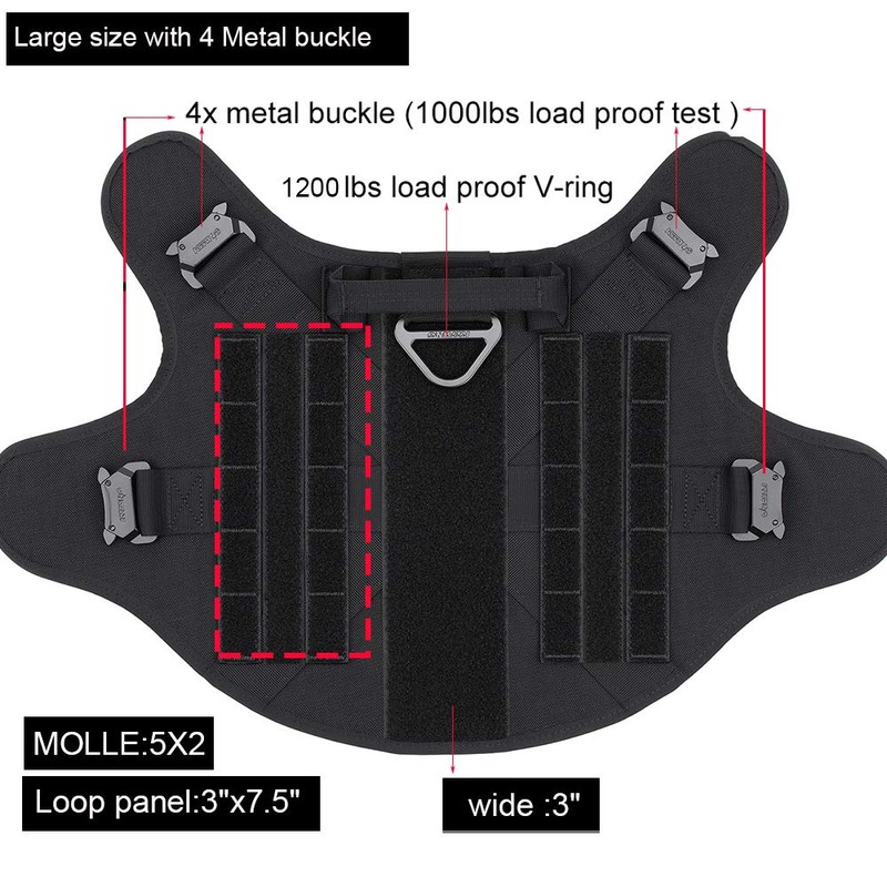 - [DOG IDENTIFIED]:Three 1" Strips of Hook and Loop Panel Sewn onto Both in the Formation of MOLLE(size in Small :3"x4.5" ; Medium :3"x6" ;Large/X-large :3"x7.5" ); One Strip of loop panel Sewn Along the Back of harness with different wide in each size ( Small: 2" ; medium/Large:3" ;X-Large /XX-Large:4");One Square Loop panel Sewn on The Front Chest (Size in small:2"x2" ; Medium:2"x3";Large/X-large:2"x4") ,You Can Attach Many Dog Patch to Identify Your Dog