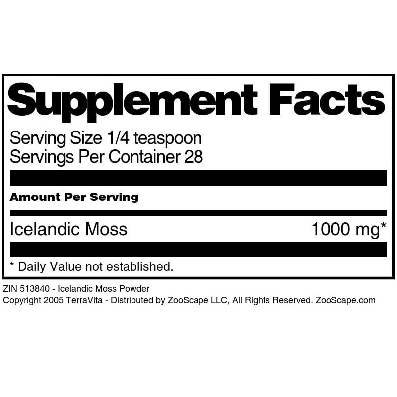 Icelandic moss, Cetraria islandica L. [Fam. Parmeliaceae], has traditionally been used as a food and health in both Europe and North America. The polysaccharides in the lichen (plant- partnership) form a moist and soothing layer over the mucous membranes of the mouth, throat, and chest making it a potential way to help support symptoms of mouth and throat concerns and colds, coughs, coughs, and acute breathing disorders. - Icelandic Moss can be used to help support inflammation and dryness of the pharyngeal mucosa in naturopathy for many years. The necessary concentration of Icelandic Moss and its therapeutic effectiveness were analyzed in a randomized- controlled clinical study with sixty-one patients who recently underwent nasal surgery. The patients suffered especially from dryness and inflammation due to breathing only through the mouth while the nose was permanently closed by a nasal package. - Fights loss of appetite, coughs, cough, skin irritations, urinary tract health concerns and much more. - Stir 1/4 of a teaspoon into a glass of water and consume 3 times daily, with meals. - TerraVita is an exclusive line of premium-quality, natural source products that use only the finest, purest and most potent ingredients found around the world. TerraVita is hallmarked by the highest possible standards of purity, potency, stability and freshness. All of our products are prepared with the highest elements of quality control, from raw materials through the entire manufacturing process, up to and including the moment that the bottles or bags are sealed for freshness and shipped out to you. Our highest possible standards are certified by independent laboratories and backed by our personal guarantee.