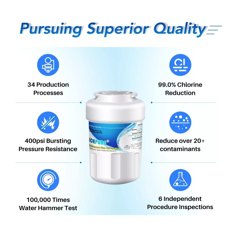 ICEPUREAuthorities CertificationMaximum filtration2-3 ICEPURE RWF0600A Refrigerator Water Filter Replacement for GE MWFGood TasteLong Service LifePerfect FitICEPURE RWF0600A Refrigerator Water Filter Replacement for Following Models: