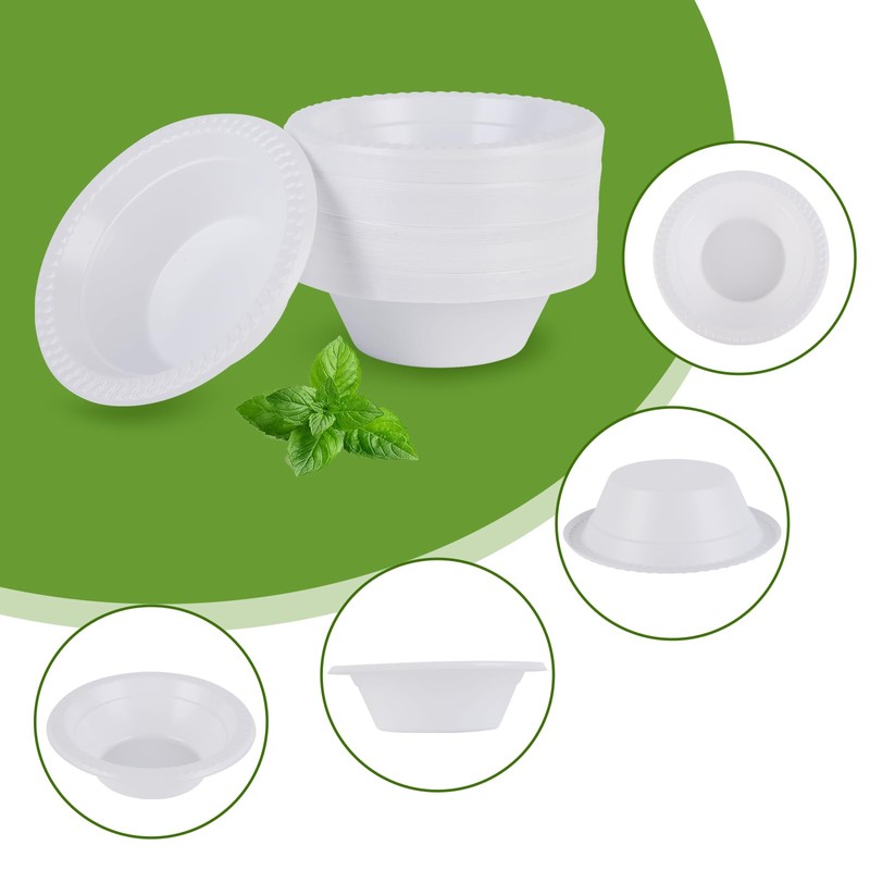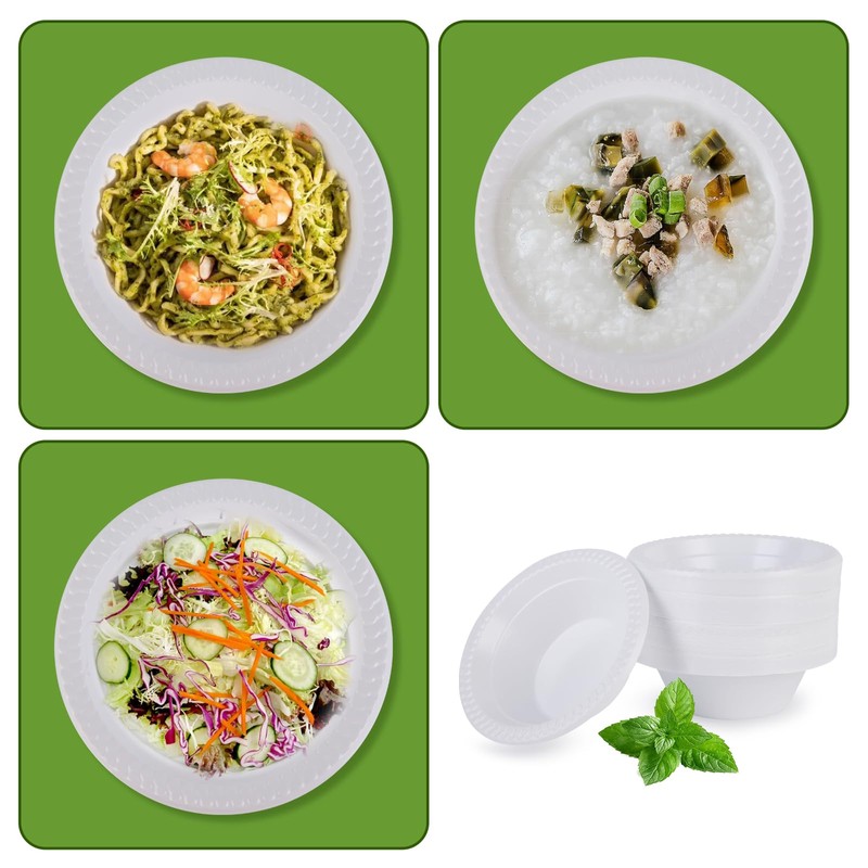 Iceten Pack of 100 White Plastic Bowls, Reusable and Washable Tableware, 12 oz Soup Bowls, Biodegradable & Compostable Bowls, Dessert Bowls, for BBQs Party Picnics Catering (100PCS)