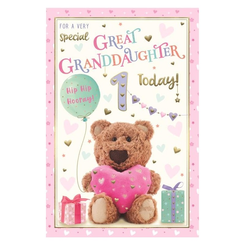 - 🎂 CUTE FIRST BIRTHDAY CARD: An adorable card featuring a barley bear teddy surrounded by gifts and a balloon with the message "For a very special Great Granddaughter, 1 today".