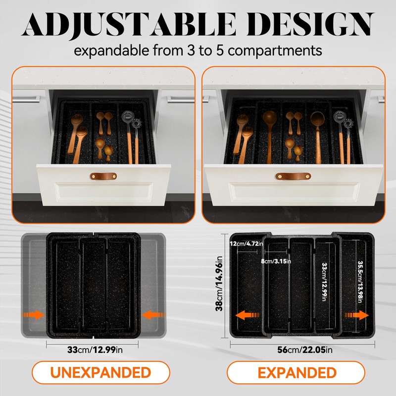 - Expandable and Adjustable: The utensil organizer for kitchen drawers can be expanded from 3 slots to 5 slots, offering extra storage space for utensils. It is adjustable to fit different drawer sizes, ranging from 13 to 22 inches wide. This kitchen utensil organizer measures 13" x 15" x 2". when folded while reaching 22" x 15" x 2" when fully expanded.