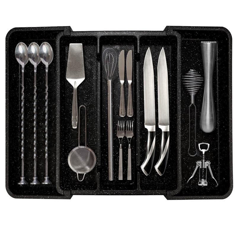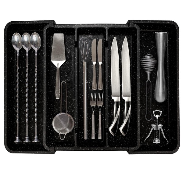 ICHROSAYA Utensil Organizer for Kitchen Drawers, Expandable Silverware Organizer, Adjustable Cutlery Cooking Utensil Tray for Forks, Knives, Plastic Spatula Tools and Gadgets Storage Divider, (Black)