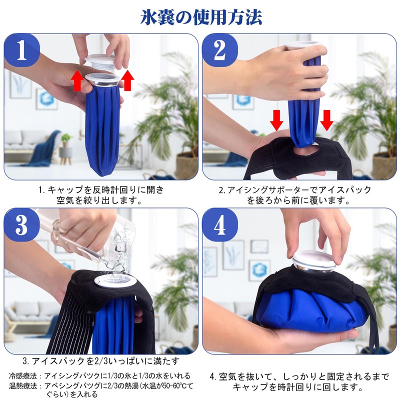 - (Cold and Hot Use) For cooling sensation, add 2/3 of ice and water into the ice bag. (★Note: If you add ice, there may be a large difference between room temperature and condensation. It is recommended to wrap it with a towel. When using hot heat, add warm water to the ice bag. (★Note: Hot water temperature is 50-60℃/ 122℉-140℉)