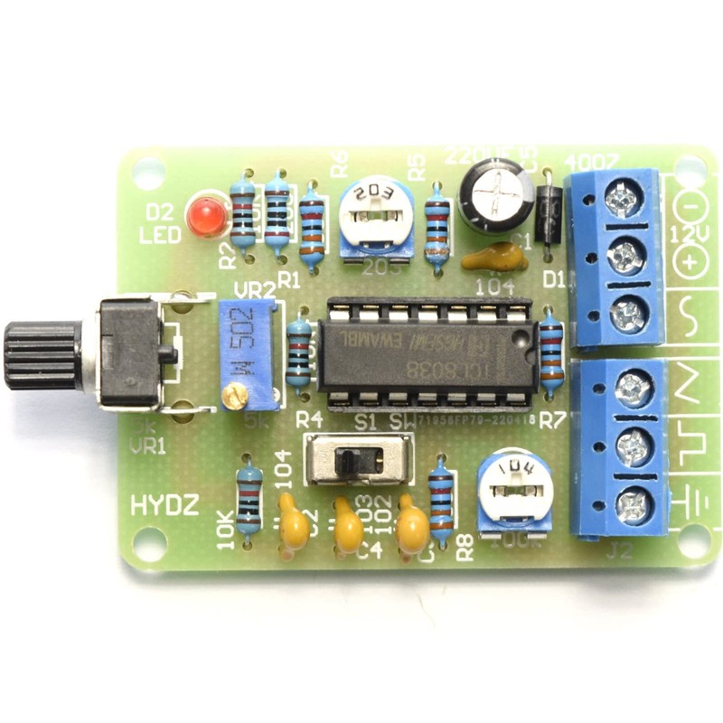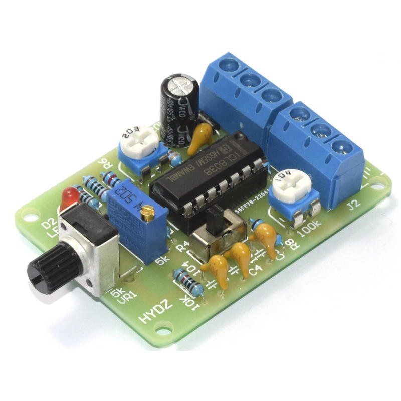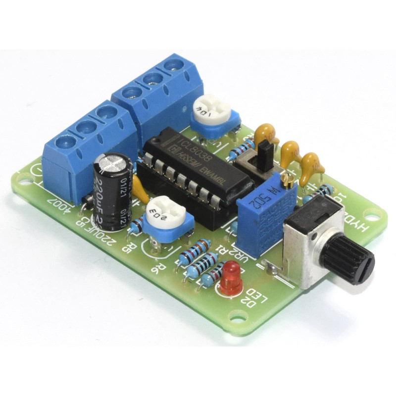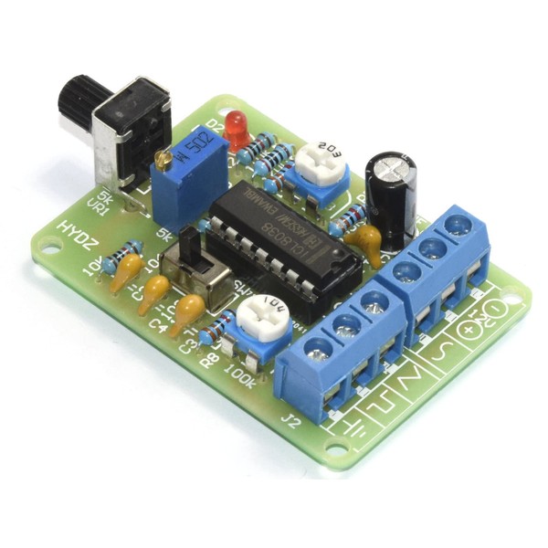 The output frequency range can be selected by a switch and adjusted by a potentiometer and a smaller trimmer potentiometer on the PCB. By replacing the capacitor value on pin 10, the frequency range can be changed within the limits of about 0.001Hz to 300kHz.