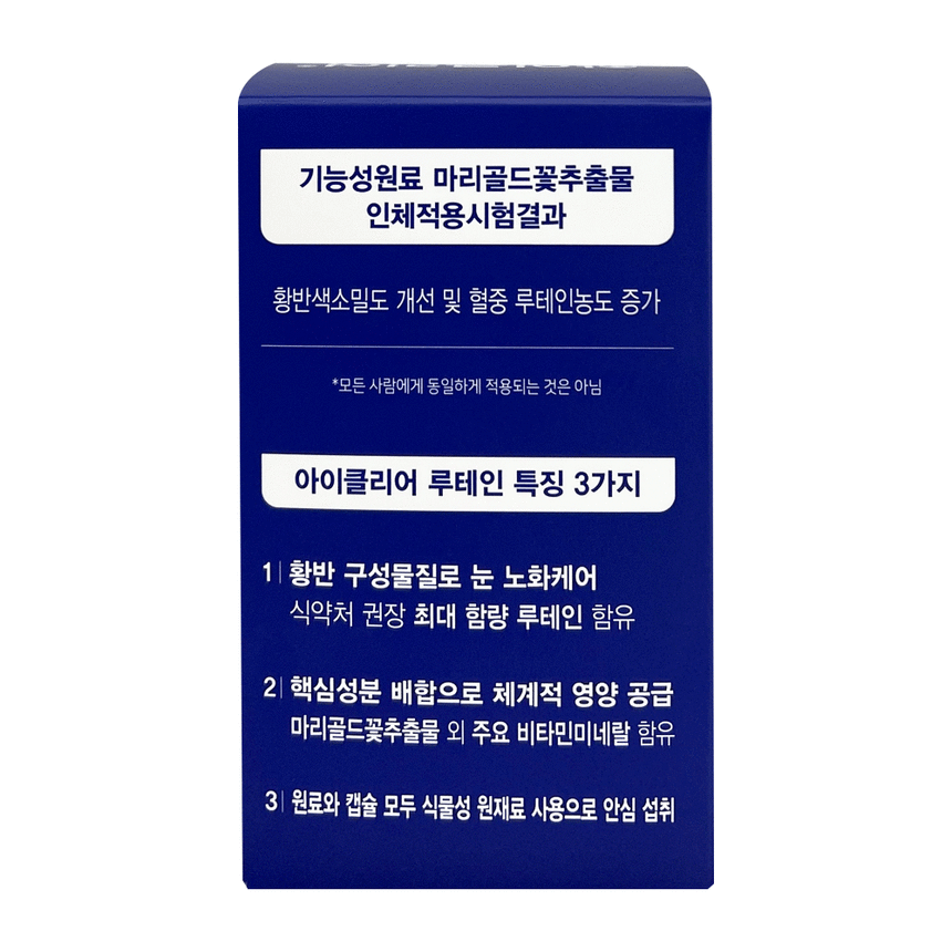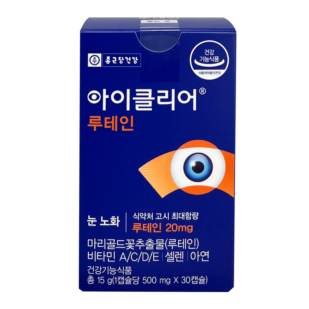 종근당 아이클리어 루테인 눈 노화 500mg x 30캡슐 12박스루테인으로 눈 노화를 늦추다.눈 나이 먹지 말고 아이클리어 먹자!하루 한 캡슐로 간편하게 관리하세요.