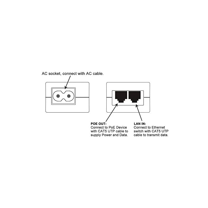 Use PoE injector with PD to expand your network to where there are no power lines or outlets,where you wish to fix devices such as AP ,IP camera or IP Phone etc. This PoE injector is a single port Gigabit PoE injector offer a compact and cost effective,it can convert standard 100-240V ac power into low-voltage.DC that runs over existing LAN cable to power up IEEE 802.3af/at compliant network accessories. Remote powering of wireless LAN(WAN) access points,IP security cameras,VoIP telephone and other low port density installations. Features: Up to 15.4W/30W of Power on 2-pairs for IEEE802.3at and IEEE802.3af POE Devices Supports 10/100/1000 Base-T applications Led indicators power input and PoE output Internal AC/DC converter no need for external power brick Easy plug and play installation Muti-protection, Specification: Pass Through Data Rates: 10/100/1000Mbps Output Power Voltage: 54~55VDC PoE Port Power: 30W max AC Input Voltage: 100-240VAC Ac Input Current: 0.5A 100-240VAC AC Frequency: 50 to 60 HZ Dimensions: 85x42x30 mm & 3.3x1.65x1.18 in System Indicator: AC power Connectors: shielded RJ-45,EIA 568A and 568B Operating Ambient Temperature: -0 to 40 Storage Temperature: -40 to 60 Installation Steps: 1.Use a CAT5 UTP cable to connect port of Ethernet devices to the LAN port 2nnect AC cable with Injector and Socket 3nnect the PoE OUT port to a PD with CAT5 UTP cable