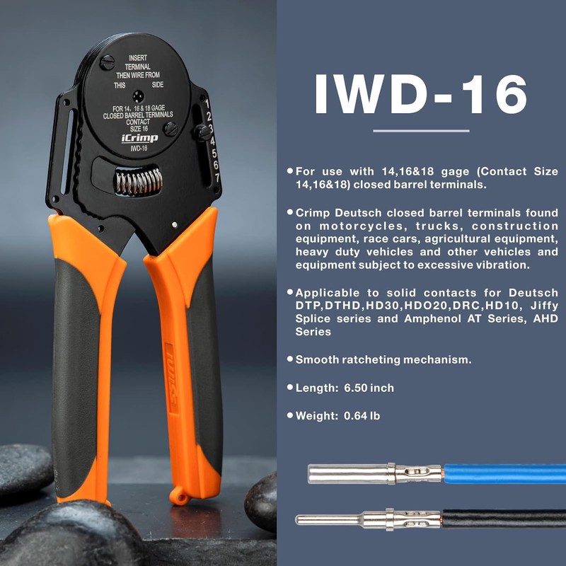 - Deutsch Crimping Tools: IWD-16 & IWD-20 ratcheting Deutsch crimpers for use with Size 16 & Size 20 Deutsch solid contacts and pins(closed barrel). Makes 4 way indent, 8 impression crimping result.
