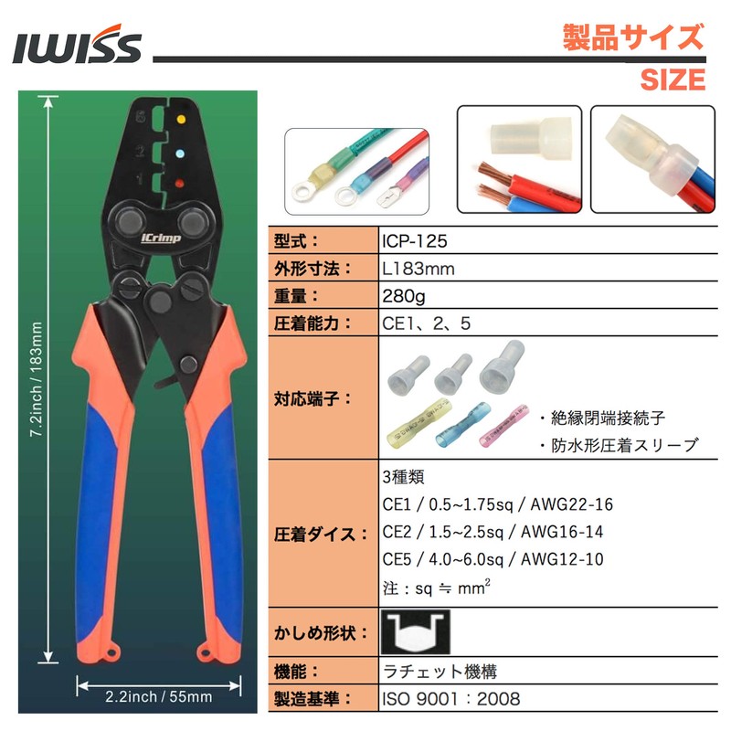 iCrimp ICP-125 CE1/2/5 Closed Terminal Connection with Insulated Coating, Heat Shrink Type, Waterproof Crimping Terminals, Crimping Tool, Crimping Pliers, Ratchet Type