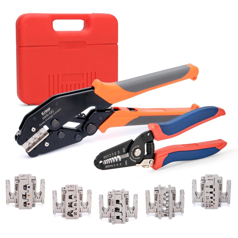 - 8PCS ALL-IN-ON TOOLSET:1pc ratchet crimper, 6 pairs of quick-change jaws, and 1 wire stripper & cutter are packed in a durable storage case. This set is ideal for electricians, DIYers, mechanics, and more.