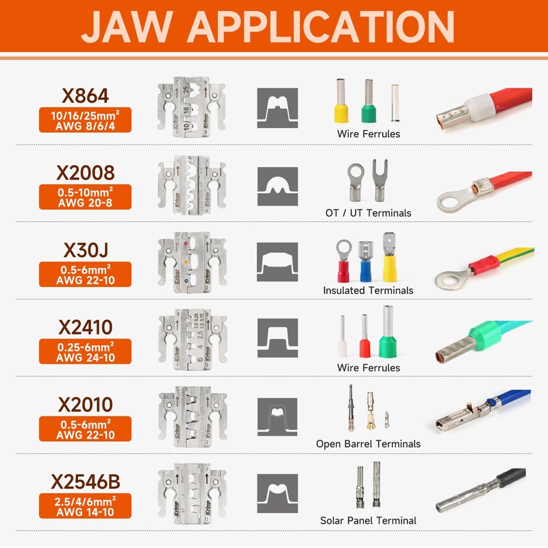 - WIDE APPLICATION: 6 pairs of quick-change jaws can be used to crimp open barrel terminals, insulated and non-insulated terminals, OT&UT terminals, end sleeve ferrules, and solar connectors.