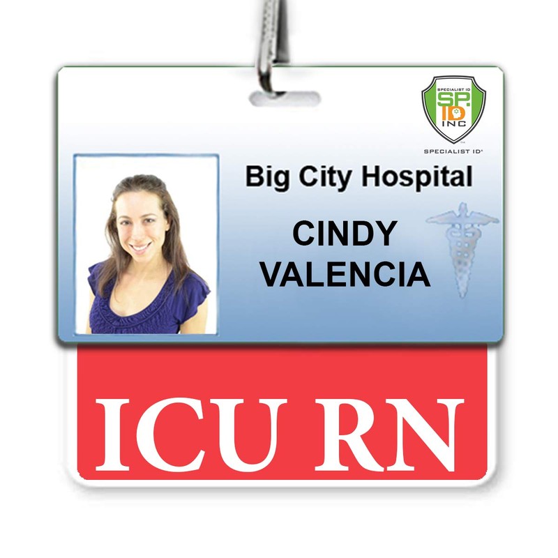 ICU RN Badge Buddy - Heavy Duty Horizontal Badge Buddies for Critical Care Nurses/Intensive Care Unit R.N. - Spill Proof & Tear Resistant Cards - 2 Sided Quick Role Backer by Specialist ID (Red)