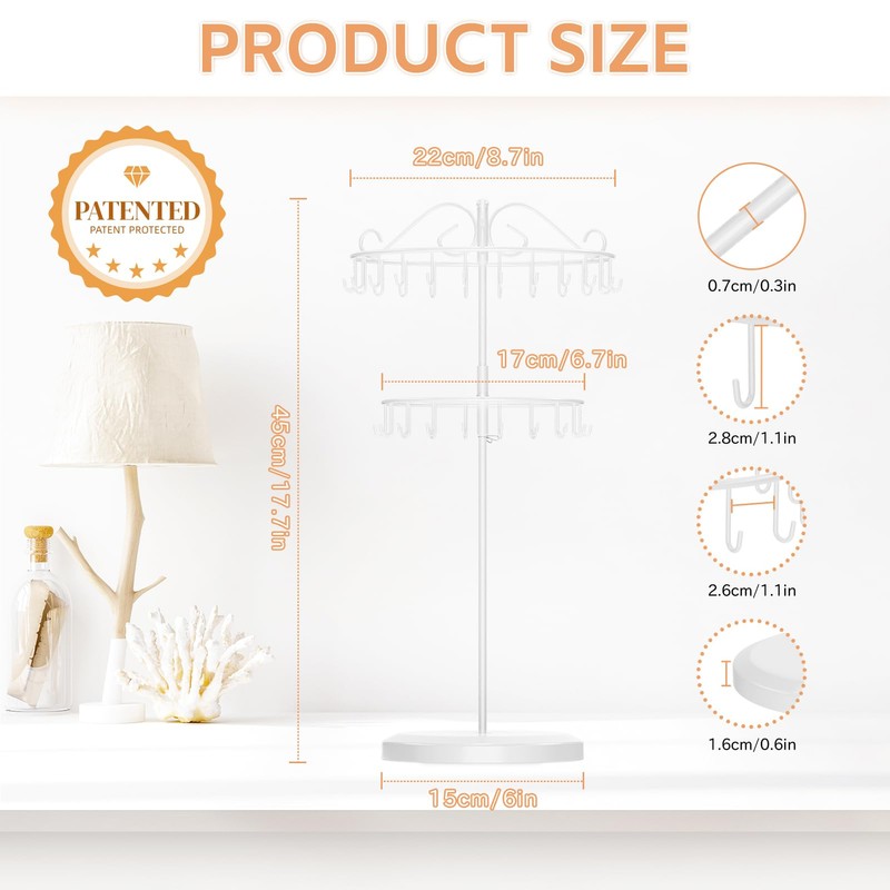 This chain stand jewellery has a unique 2-tier design with large capacity and 42 hooks for storing more jewellery, at least 42 necklaces. This chain storage can also be used to store bracelets, rings, watches and other jewellery.