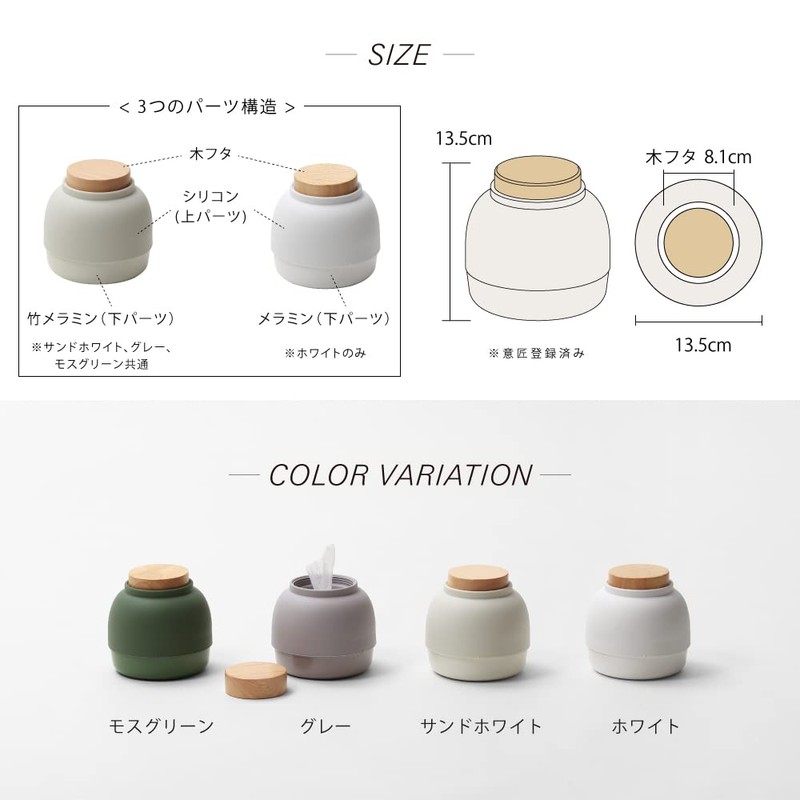 - Materials: Silicone, bamboo melamine (body), rubber wood (mildew resistant PU coating/lid). *Surface matte finish