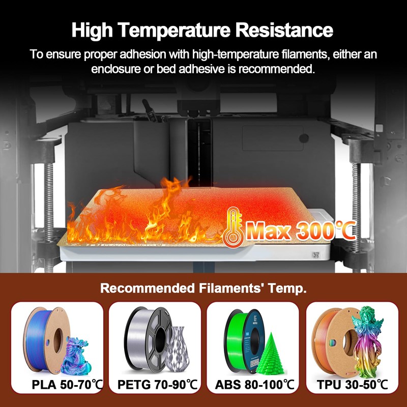 - 【Compatible Filament】PEI build plate supports a wide range of filaments, including PLA, PETG, TPU, ABS, ASA, PVA, PET, PA, PC, Nylon, and Nylon-CF, with a high-temperature resistance up to 300°C.