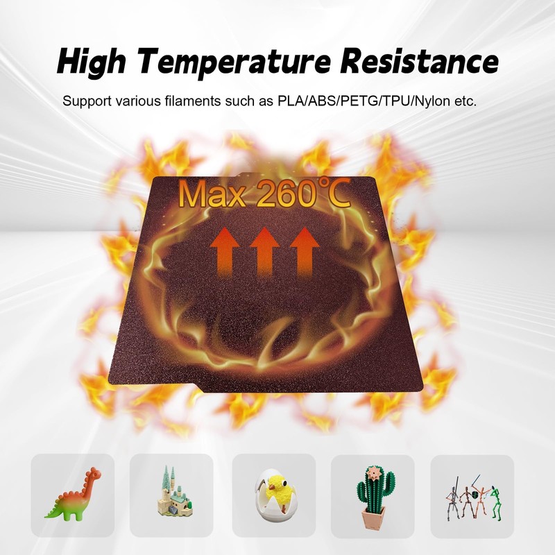 - Compatible filaments: The pressure plate supports high-temperature filaments such as PLA, PETG, ABS, TPU, nylon, etc. The maximum temperature of the textured PEI side is 260 °C.