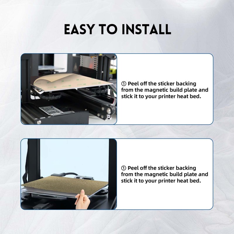 Our PEI sheet combines with 2 parts, the double-sided textured PEI powder coated spring steel and a magnetic base plate with 3 metre adhesive on the back. Simply stick the magnetic base plate to your heating bed, then place the steel platform with PEI surface on the top. The model can be easily removed by bending the plate when the bed temperature cools.