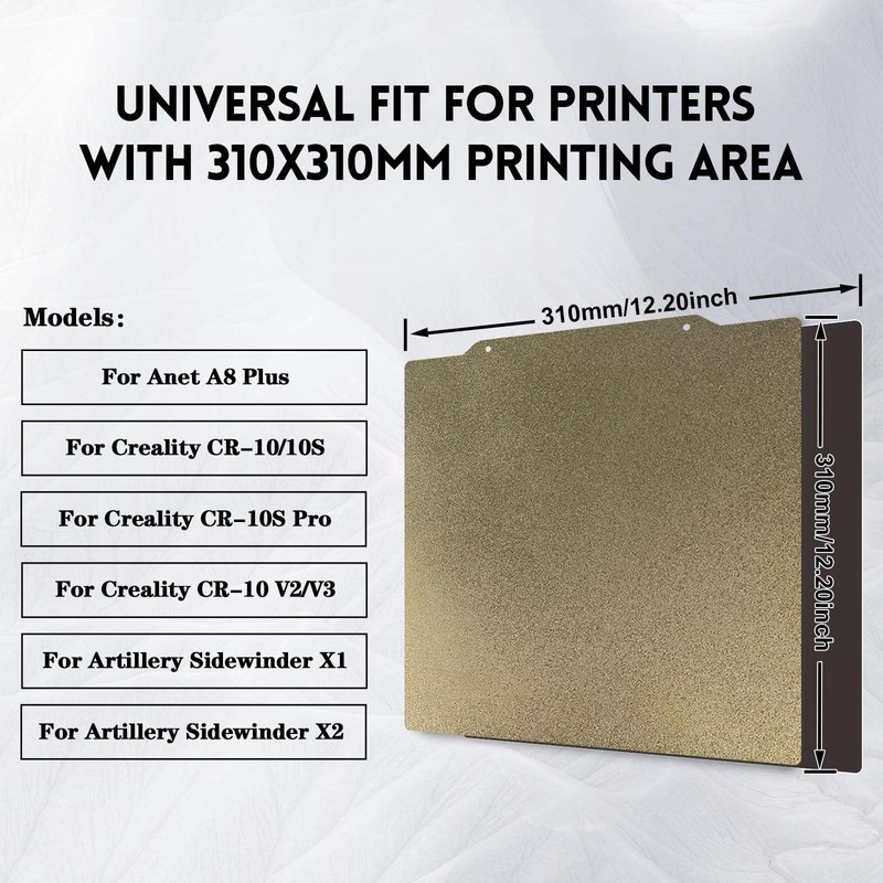 - 【Compatible 3D Printers】Our double-sided textured PEI sheet fits for 3D printer with platform size 310x310mm, for Ender CR-10, Artillery SW-X1/X2, Anet A8 Plus, please confirm the size of yours 3D printer platform before ordering.