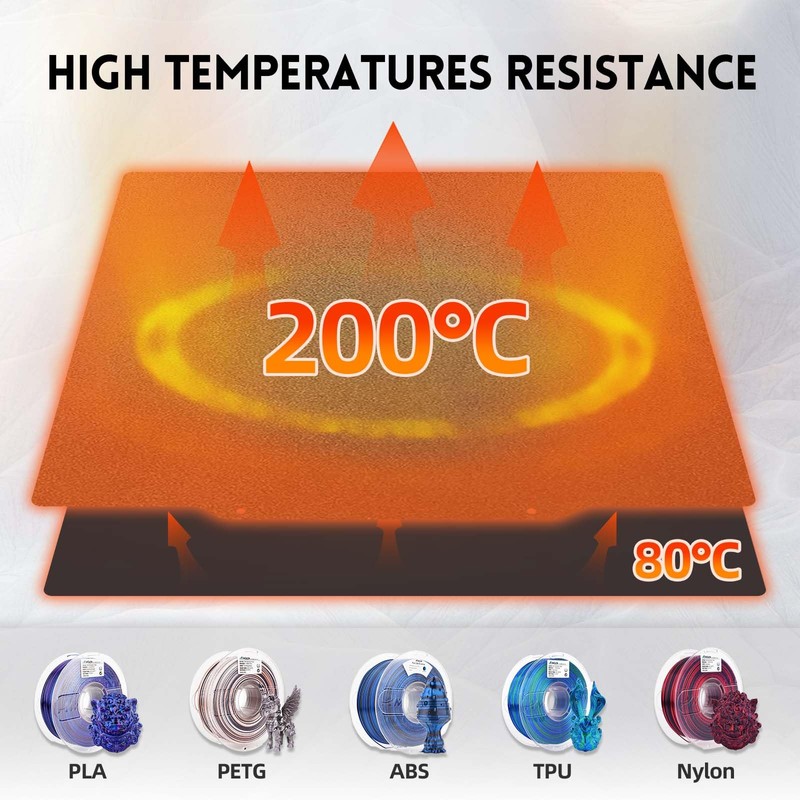 - 【Heat Resistance】The PEI sheet can be adsorption on top of any existing magnetic bottom. It is resistant to 200℃ and magnetic bottom sheet is not for use with high-temperature printing applications above 80℃.