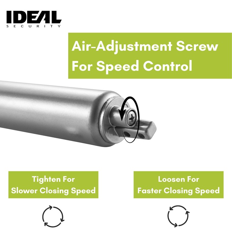 - Door Closer Adjustment: You control how fast or slow your door closes by turning the speed adjustment screw at the end of the light door closer tube