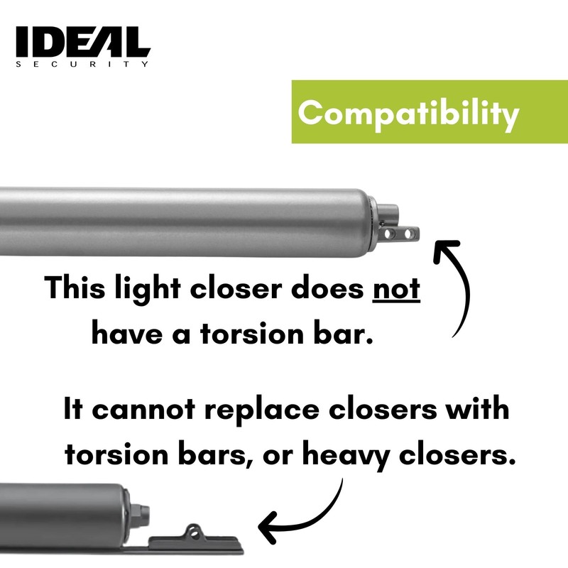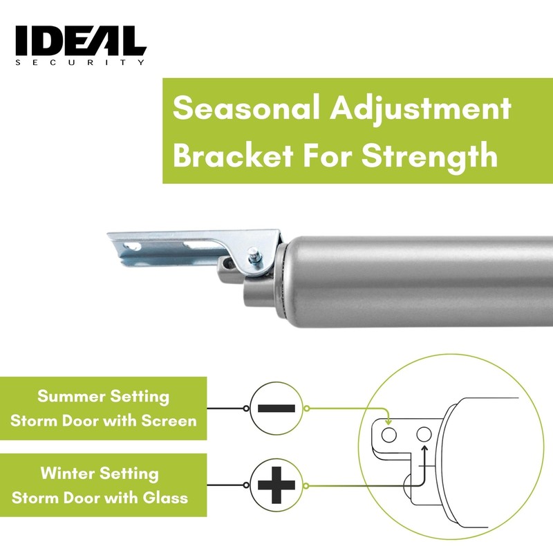 - Dimensions: This Ideal Security storm door closer has a length of 9” and a diameter of 1.25”; when selecting replacement door closers for home use, be sure to select the exact same type of closer that came with your door