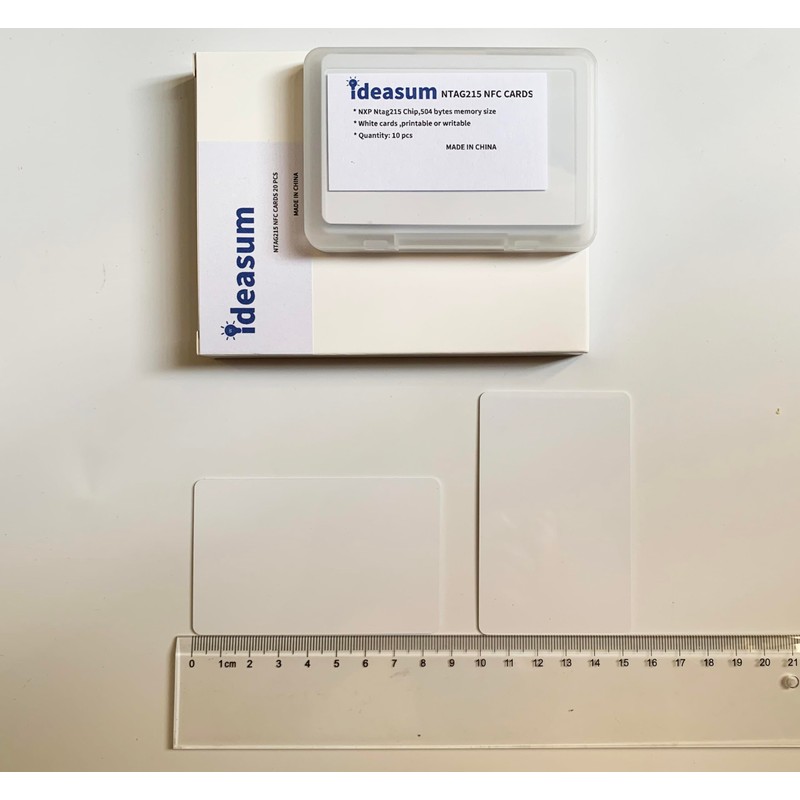 - Package:it contains 20 pcs NTAG215 cards, cards in size of 85x54x0.8MM (same as credit card), The cards packed into 2 pcs PP transparent boxes then into a white box.