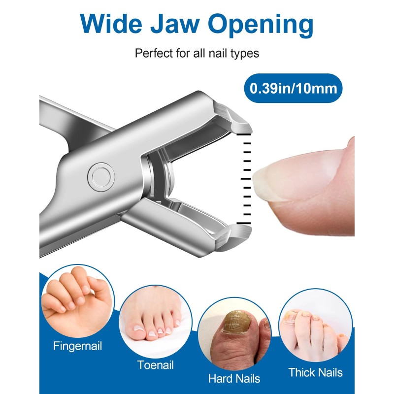 Wide Jaw Nail Clippers for Thick Nails: With a 10mm extra-wide opening, these large nail clippers easily cut thick toenails and hard fingernails; The labor-saving lever boosts cutting power for a clean, precise trim with minimal effort