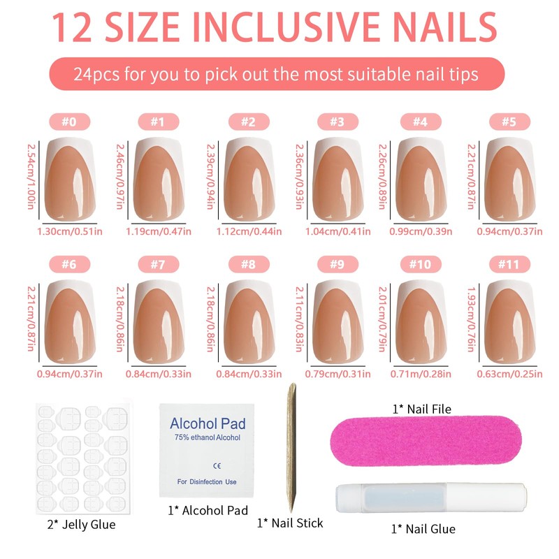 - Fake Fingernails with Guaranteed Perfect Fit: Includes 24 nails in 12 sizes for a seamless match to every nail bed. Each kit comes with premium accessories: dual-grip adhesive tabs, nail glue, precision cuticle stick, alcohol prep pads and nail file.