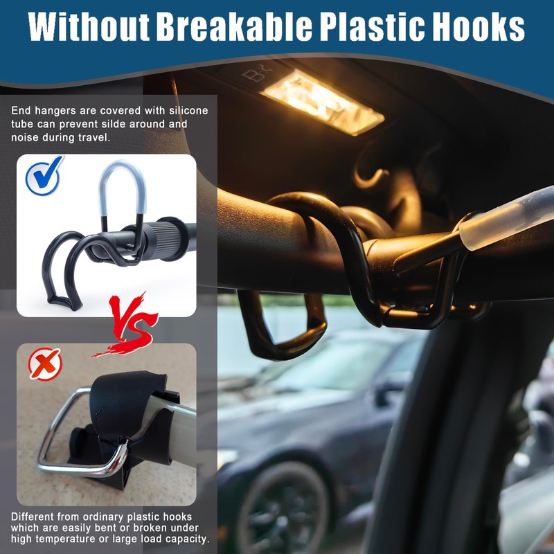 - Without Breakable Plastic Hooks --- Clothing bar end loops and hook are constructed of metal that will last longer, different from ordinary plastic hooks which are easily bent or broken under high temperature or large load capacity; End hangers are covered with silicone to mitigate potential impact and noise or against it falling during driving, also protect car interior.