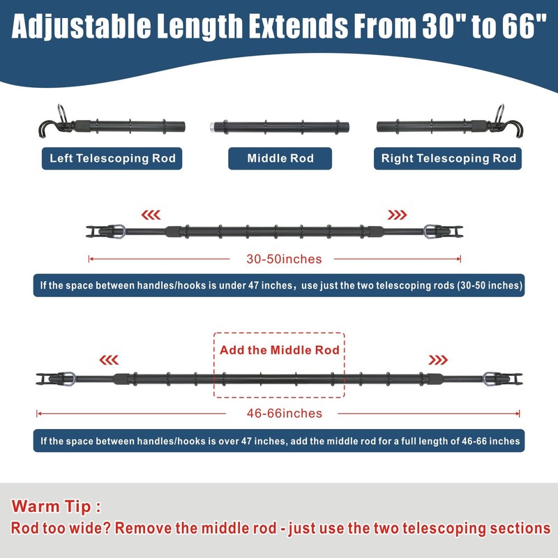 - Strong Load Capacity & Extendable --- Heavy duty clothes rack is sturdy and constructed with 1mm thick metal alloy rods that won’t easily bend or break, it can hold up to 120 pounds of clothing(approx 50-70 pcs), Expandable hanging rods for clothes also has a good extension range from 30 to 66 inches, simply assemble each part by hand and adjust it to your desired length to fit different vehicle sizes and types.