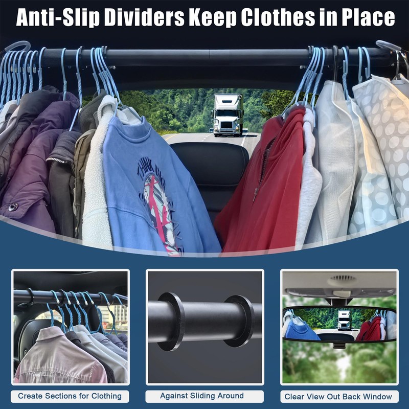- Create Sections for Clothing and Rear Window Viewing --- Automobile clothing bar comes with 6 anti-slip rubber dividers that are movable and adjustable to separate clothes, coats, pants, shirts all neatly hanging in expedition trip, also conveniently create clothing sections for family members, in addition vehicle clothes storage and organization pole can prevent clothes from sliding to one side or the other and being bunched up or fly around during sharp turns or on uneven roads.