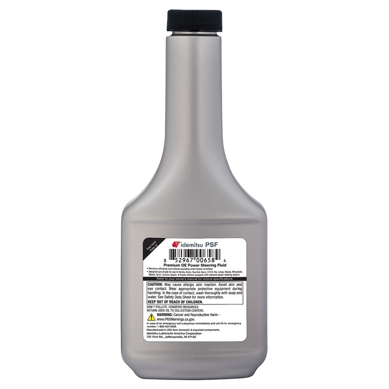 - [Maintain Driving Efficiency]: With the Idemitsu PSF Power Steering Fluid you can easily flush out old PSF from your vehicle to maintain efficiency, improve driving operation, and reduce noise in your steering column; 12-ounce (355mL) vehicle power steering fluid bulk package includes 12 bottles