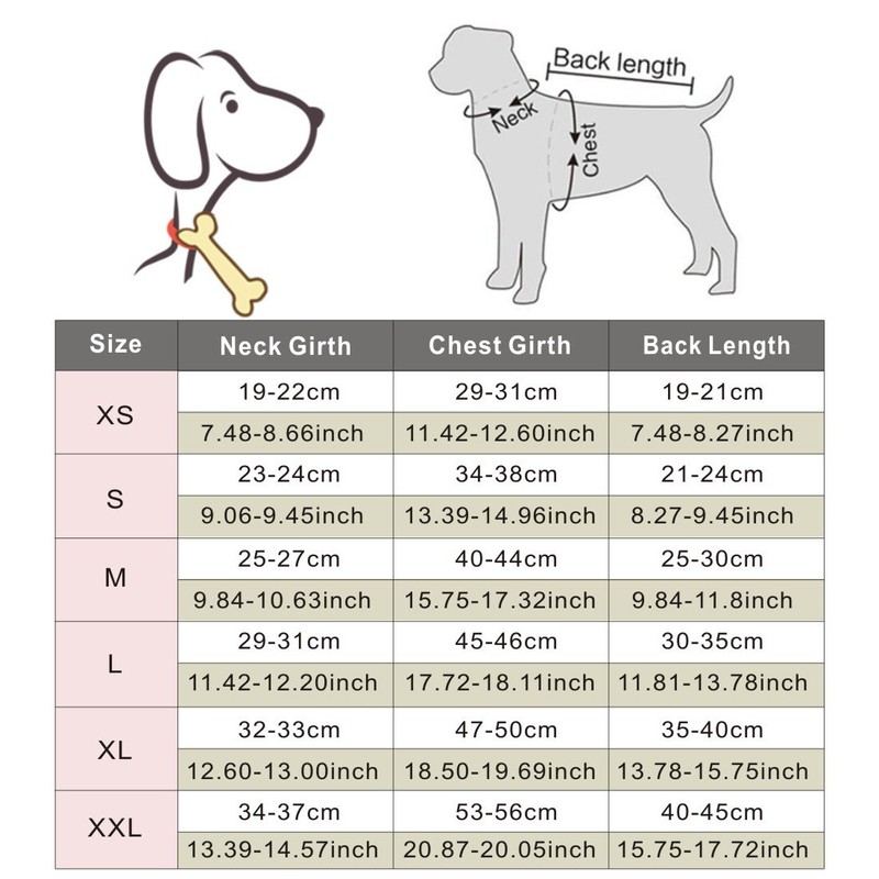 - Please note: Please do not choose size according to your usual size. Please measure your pet's neck, chest, back length and refer to size information before you buy. When your pet grows, please choose one size up.