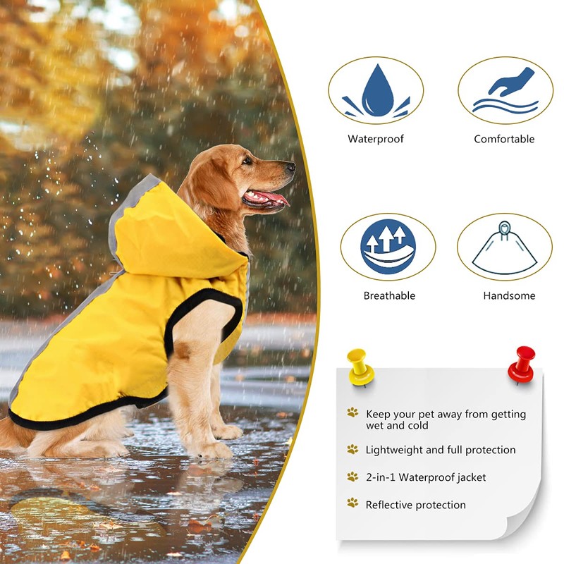 - 2-in-1 dog raincoat jacket: the lightweight dog raincoat is made of high-quality waterproof and wrinkle-free material. It has high water-resistance and high breathability; the unique storm fabric can be used as a raincoat or outdoor coat for dogs to protect your dog.