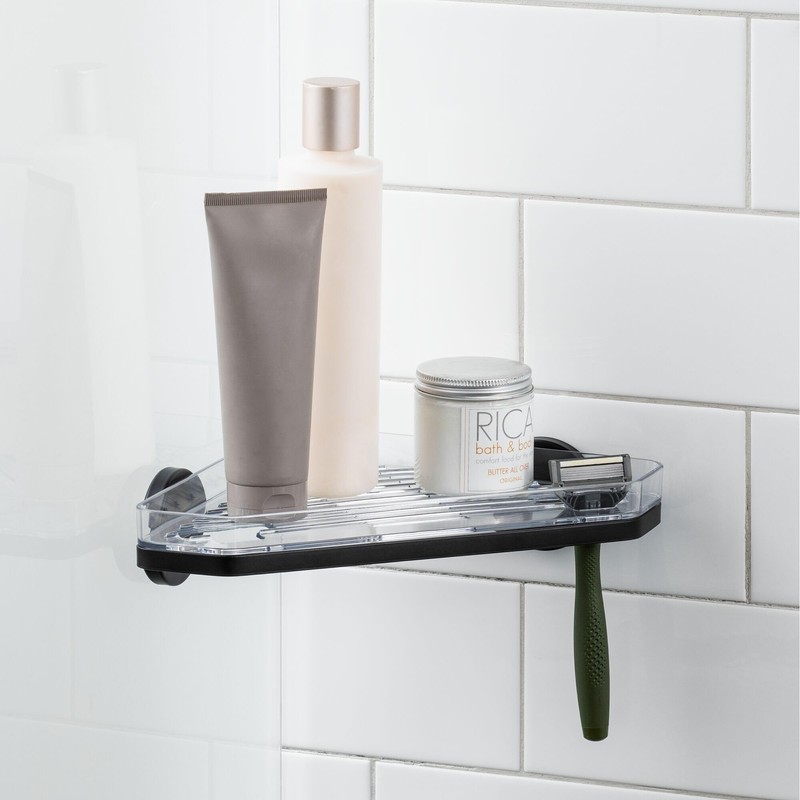 - SELF-ADHESIVE TECHNOLOGY - The improved adhesive strength stays put in moist, humid environments, making it ideal for placement inside the shower or out; Adheres to most smooth, flat surfaces such as tile, glass, metal, mirror, etc.; This no-drill bath accessory creates instant, damage-free hanging while saving valuable shower space