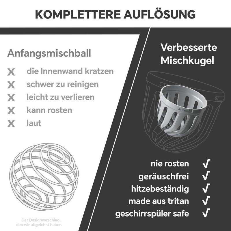 - Perfect mixing technology: the stainless steel shaker impresses with a precision-developed mixing system: removable mixing agitator and heat-resistant Tritan mixing ball (food-safe) crush powder quickly and completely silently. Ideal for protein shakes and nutrient drinks without lumps