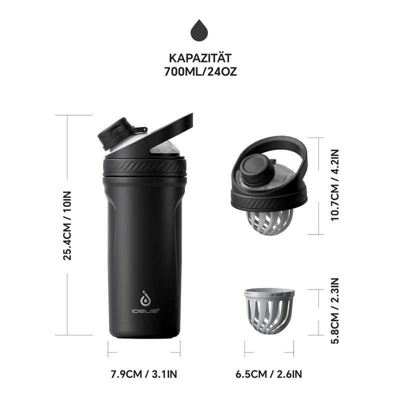 Ideus Shaker Protein Drinking Bottle 710 ml (24 oz), Double-Walled Stainless Steel Sports Bottle with Mixing Ball, Metal Protein Bottle with Mixing Ball, BPA-Free, Leak-Proof Screw Cap