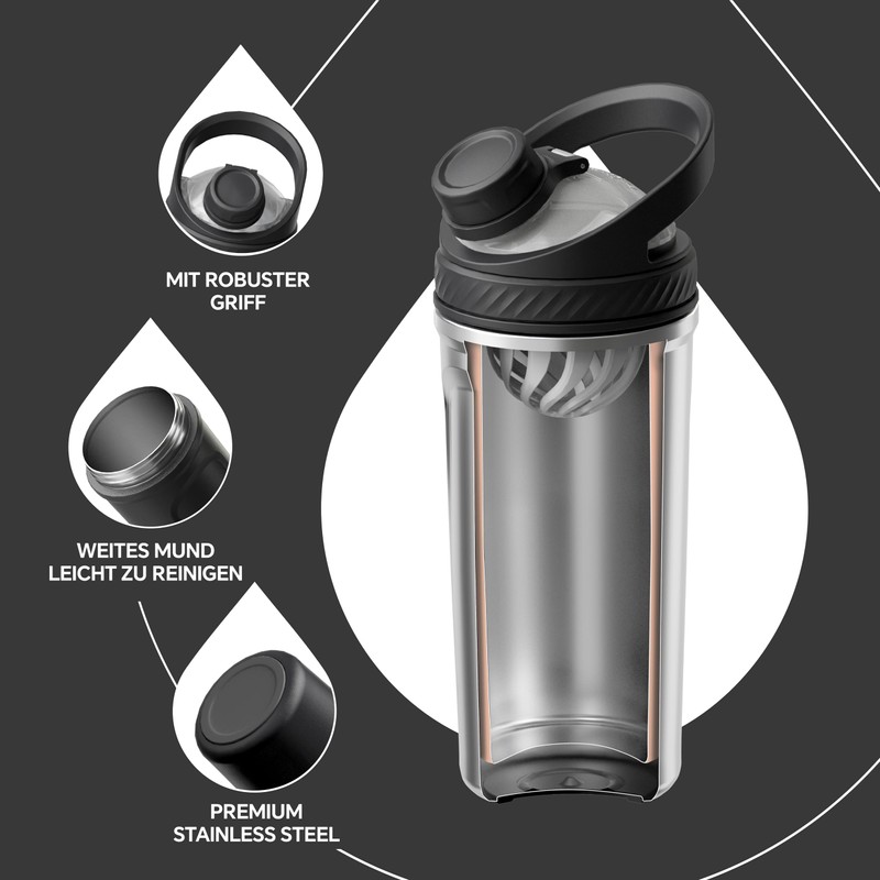 - Your all-rounder for active people: the durable stainless steel protein shaker accompanies you stylishly to the gym, in the office or on hikes. The slim design with premium look makes it the perfect gift for health enthusiasts. More than just an ordinary sports shaker - your upgrade for smart nutrition!