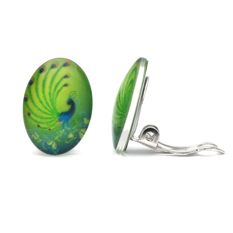 Idin Jewellery - Green Peacock Oval Shape Glass Print Clip on Earrings