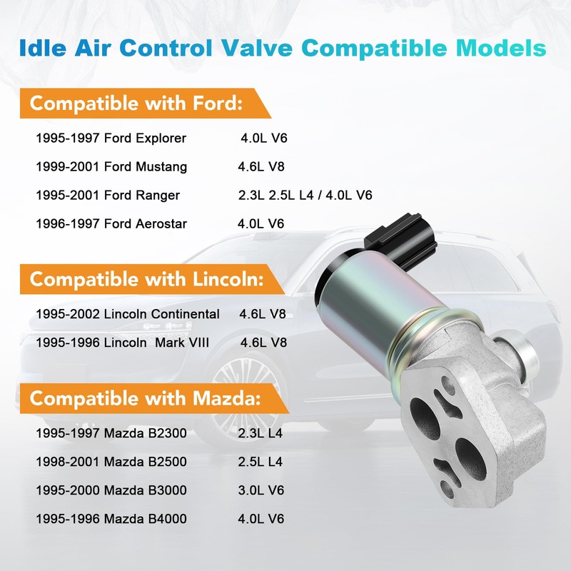 - Vehicle Fit - IAC Idle Air Speed Control Valve Compatible with 2.3L 2.5L 3.0L 4.0L 4.6L 1995-1997 Ford Explorer | 1999-2001 Ford Mustang | 1995-2001 Ford Ranger | 1996-1997 Ford Aerostar | 1995-2002 Lincoln Continental | 1995-1996 Lincoln Mark VIII | 1995-1997 B2300 | 1998-2001 B2500 | 1995-1996,1998-2000 B3000 | 1995-1996 B4000
