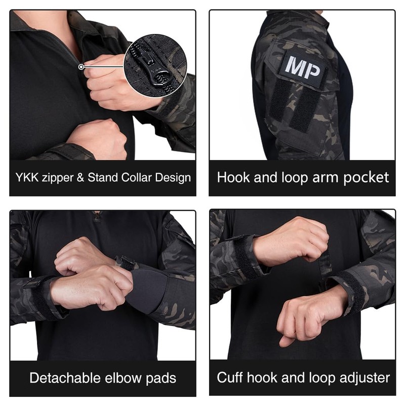 - TOP SHIRTS: Two hook and loop closure pockets on each side of the arms, hook and loop panels for hanging various badges, such as team logo, flag, blood type badge, etc; two removable hidden elbow pads at the elbows to provide extra protection in action.