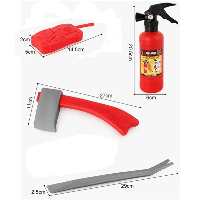 - Kids Fireman Costume Set Includes a Fireman Jacket, Fireman Pant, Fireman accessories include a Fireman Hat, fire extinguishers and an axe,a crowber,a toy Walkie Talkie,Perfect for your little kids to be a Fireman.