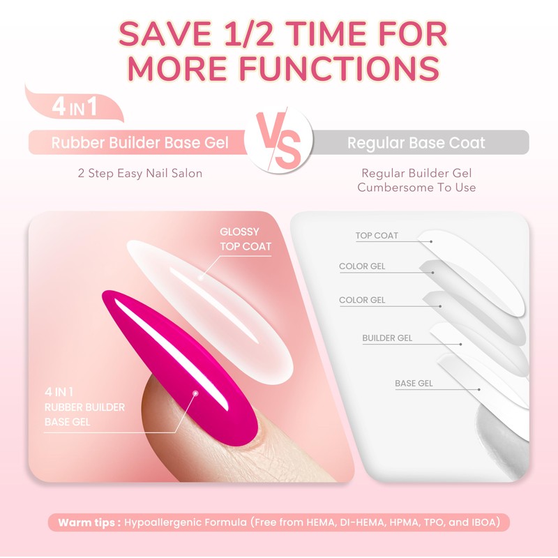- Easy to apply and lasts long: Start with clean,dry nails,Apply a thin layer of our HEMA & TPO Free 4 in 1 Builder Base Gel and cure under a UV/LED lamp for 60 seconds, Then, add a thicker layer, allowing it to self-level or refine with a liner brush, and cure for 60 o 90 seconds, Finish with our HEMA& TPO Free Top Coat, curing for another 60 seconds, Enjoy salon-quality polished nails!
