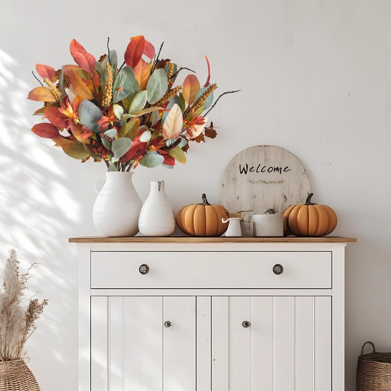 - Rich Harvest inspired elements: Celebrate the season's harvest with autumn harvest wreaths filled with natural textures. The mix of rabbit leaf, red, yellow, and olive green leaves creates a layered and organic look that reflects the Thanksgiving harvest.