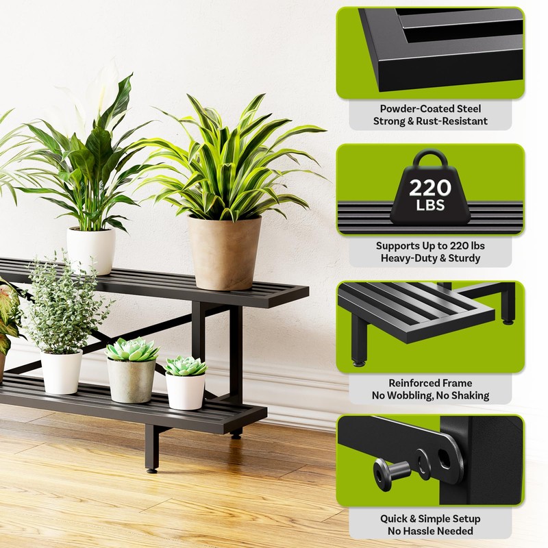 - HEAVY-DUTY STEEL CONSTRUCTION: Built with strong steel, our metal plant stand supports up to 220 lbs per layer without bending or warping; The sturdy frame ensures maximum stability, making it ideal for heavy pots and planters indoors or outdoors; ideal for enhancing your living room decor and creating a stylish outdoor decor setup
