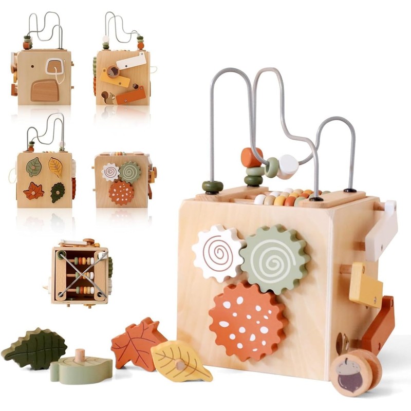 - 5 in 1 Wooden Activity Cube:This interactive educational toy allows your kids to play 5 games in 1 toy:gear rotation, bead maze,leaves shape sorter,pinecone slide rail and board acence.Great wooden learning toys to keep your baby occupied and entertained while actually learning things.