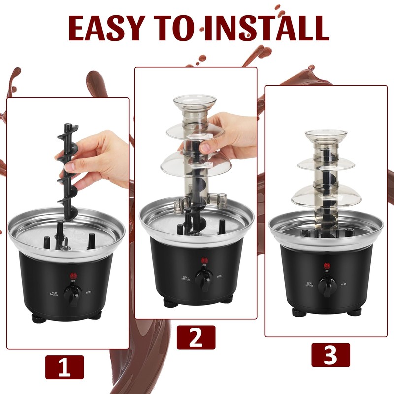 - HEALTH & SAFETY: IEBIYO chocolate fountain is made of food grade stainless steel base and a tiered design, BPA free. Chocolate fondue fountain machine can be in direct contact with food to ensure safety and hygiene. Please clean the stainless steel base and wipe the tray before use.