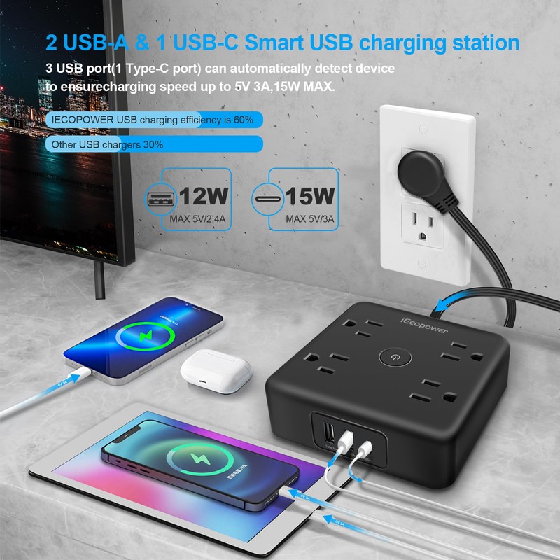 - 【7 in 1 Desktop Power Strip with usb ports】-Surge protector power strip With 4 AC outlets and 3 USB ports(1 USB C Port), this USB power strip can charge up to 7 devices simultaneously with no more than 1250W/10A. The built-in smart IC chip automatically adjusts and provides optimal charging speed for your electronic devices with USB power output up to 2.4A/port, USB C port MAX 5V/3A, 15W total.