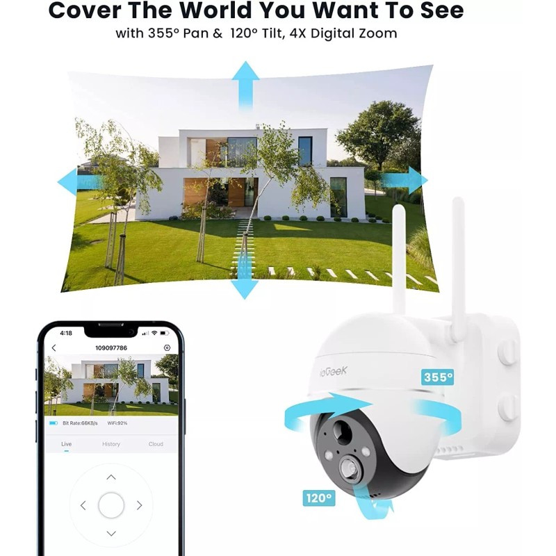 - 【Cloud/Memory Card Storage & Remote Viewing】ieGeek CCTV solar battery camera supports cloud storage and Memory card storage (up to 128GB, not included), They can increase your home security by letting you check in on your property from wherever you are, see a live feed of your home on a smartphone or computer, and get immediate alerts of any unusual activity.