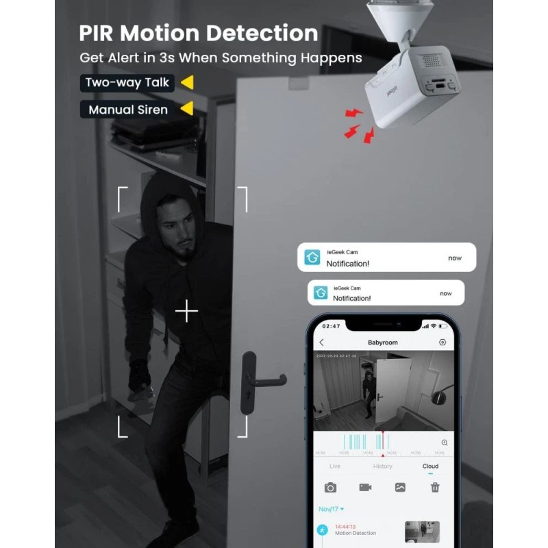 đŹă2-Way Audio & Built In SirenăBuilt-in microphone and speaker allows you to keep in touch with your family, pet, visitor by remotely controlling the ieGeek Cam APP when off-site. This indoor camera wireless also supports manual siren to scare away the unexpected intruder, keep your property safe. ieGeek provides you 2 YEARS warran*y. đ„°